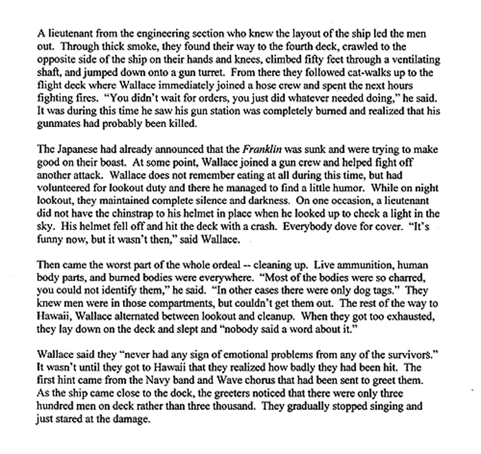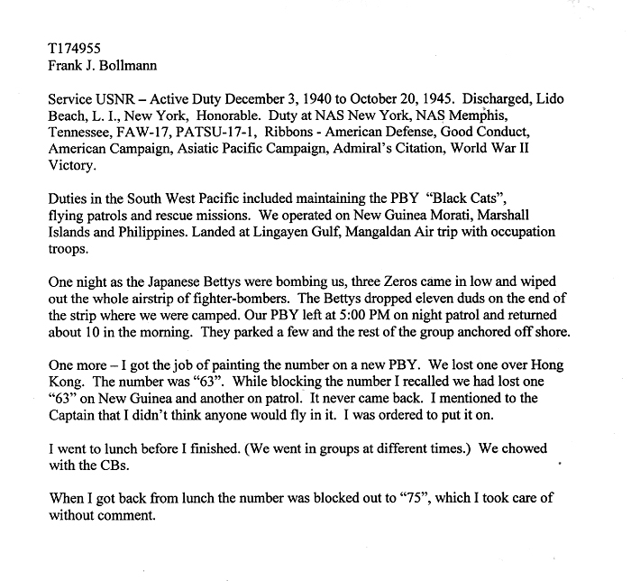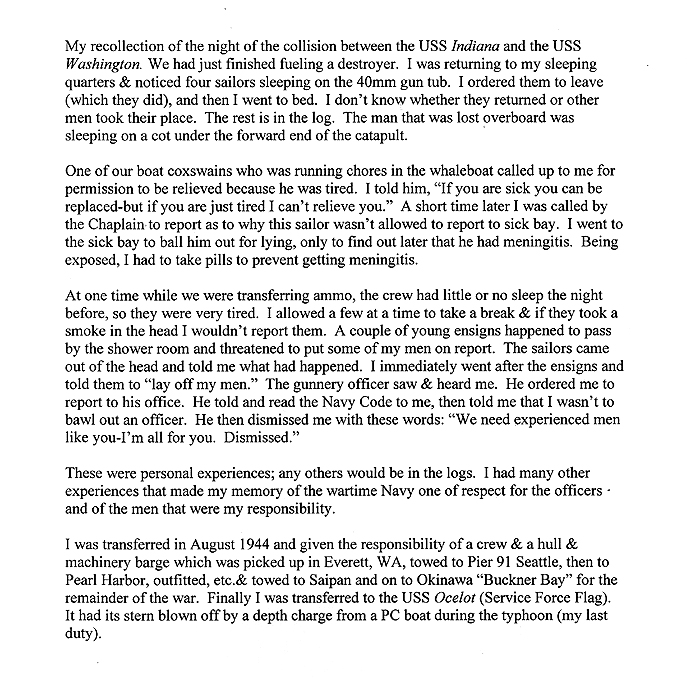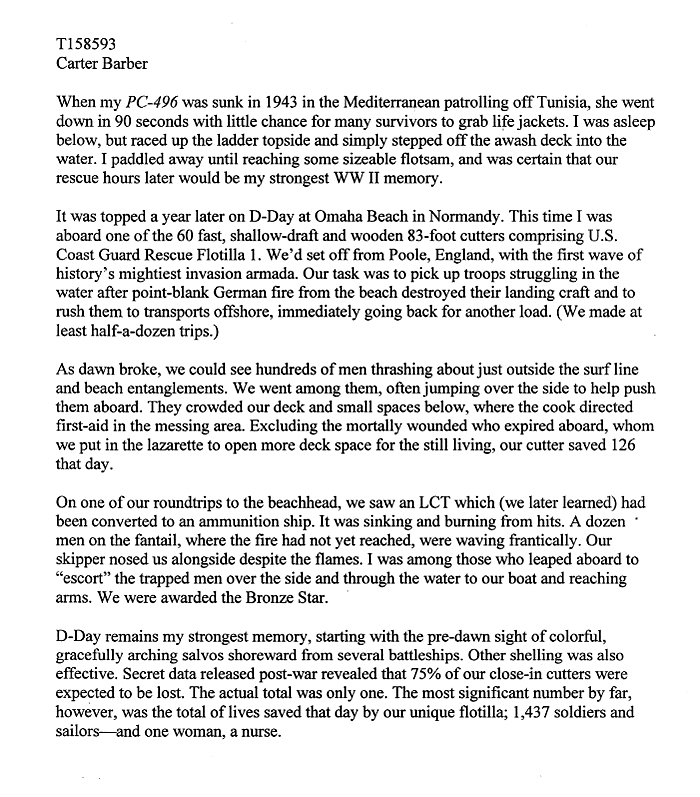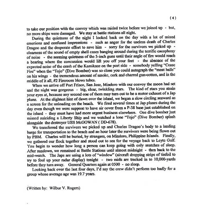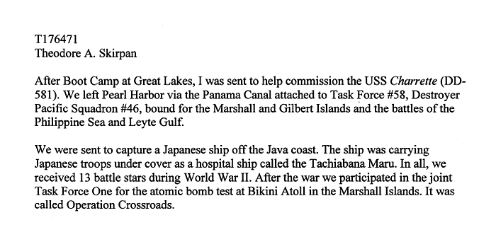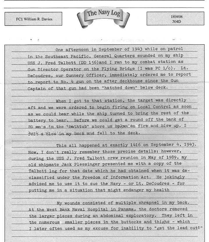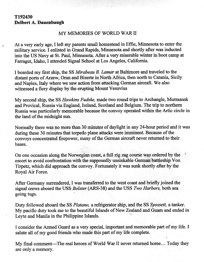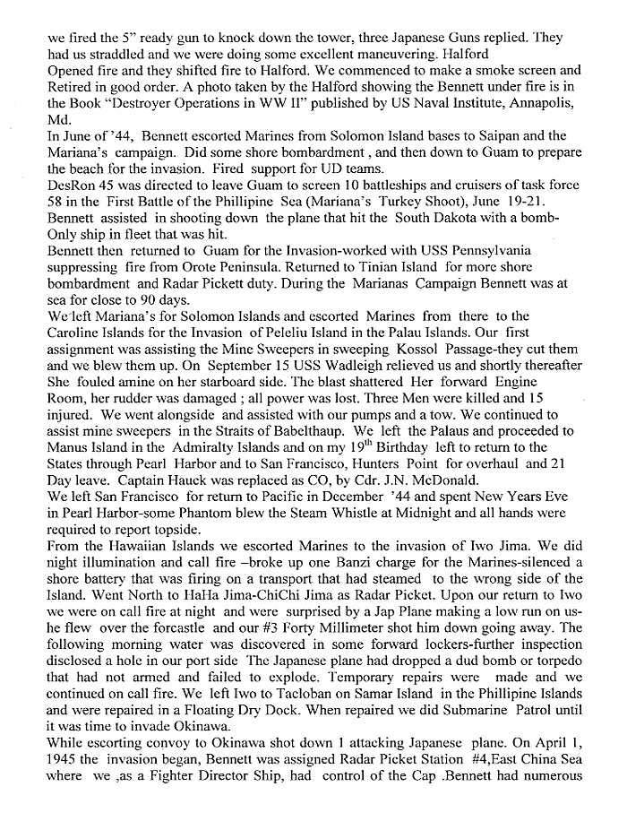 Theodore Dachenhausen Jr. served on the U.S.S. Steamer Bay, CVE-87 during the last part of World War II as the Fighter Director. After the war he graduated from Yale in the class of '45W, and then completed law school. He married Mary Louise Hudson (herself a Navy Nurse in the war) to whom he remained married until her death in 1987. He stayed in the Navy Reserve after the war, and was recalled to active duty for the Korean Conflict, in which he served as a Navy JAG lawyer in Japan (where his first son, Theodore III was born). He then returned to civilian life as an attorney and, later, a judge. He remained in the Navy Reserve until the early 1970s, retiring at the rank of Lieutenant Commander. He died in 1988 of cancer while still on the bench of the New York State Supreme Court. He was, until the end of his life, extremely proud of his service in the United States Navy.