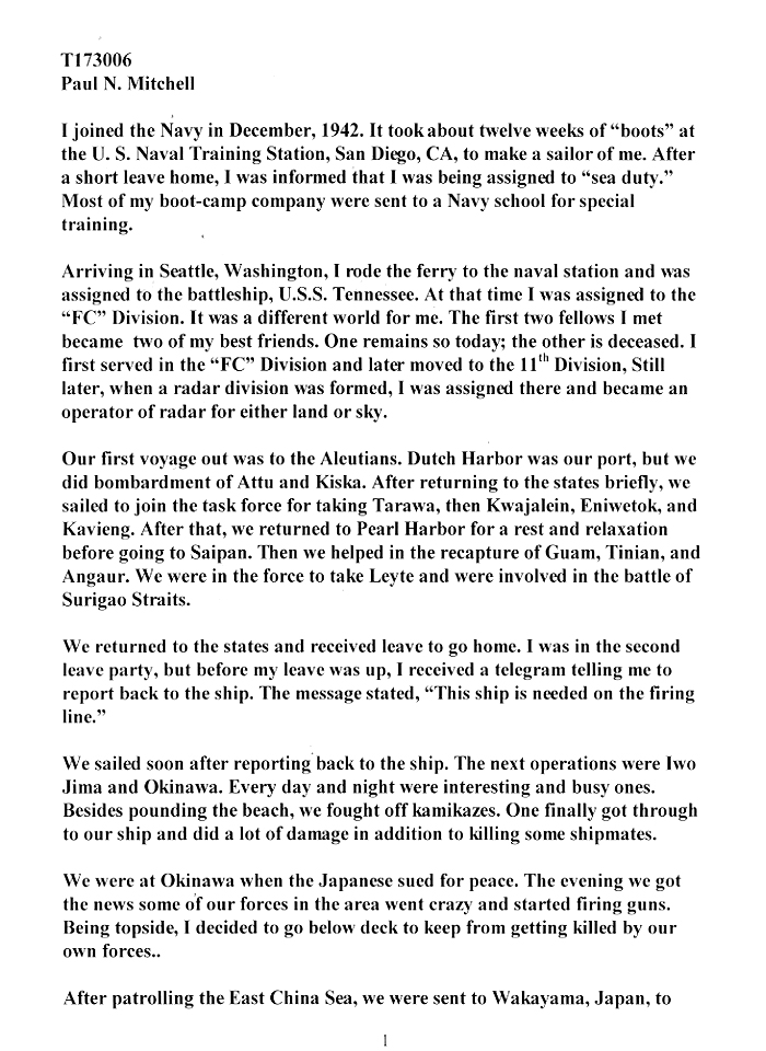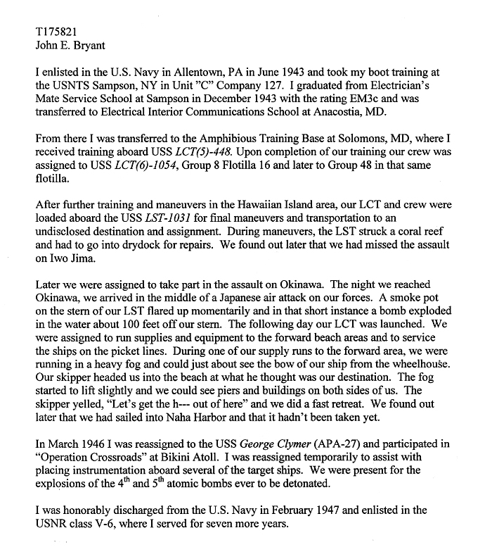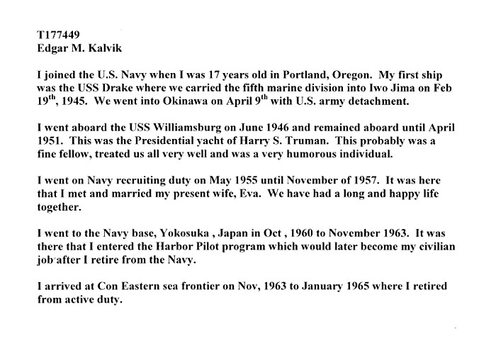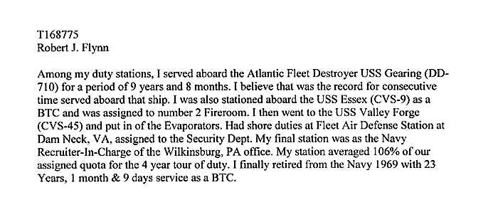 I enlisted in the Navy on 14 March 1952. After completing 11 weeks of boot camp at San Diego, CA. Love of flag and country was my incentive for the journey ahead.