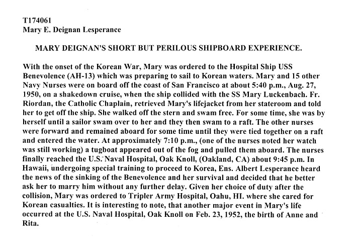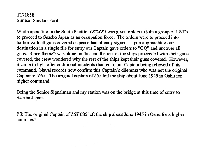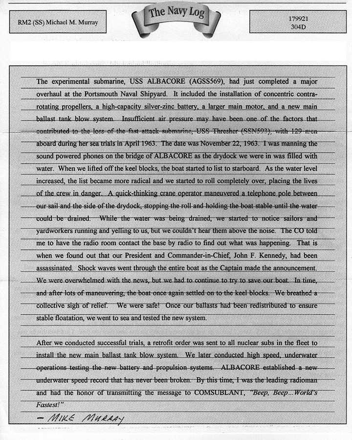 LT Ronald J. Secord of San Diego, California, joined the Navy in March 1948, and served as an enlisted man until November 1963, when he was commissioned as an Ensign.  As an enlisted man LT Secord served at the Port Facility, Tsingtao, China; on USS Passumpsic AO-107; as craftmaster of LCU- 859; at RSA Yokosuka; at Naval Magazine, Port Chicago, California, and as a First Class Diver on board Uss Sunbird ASR-15.