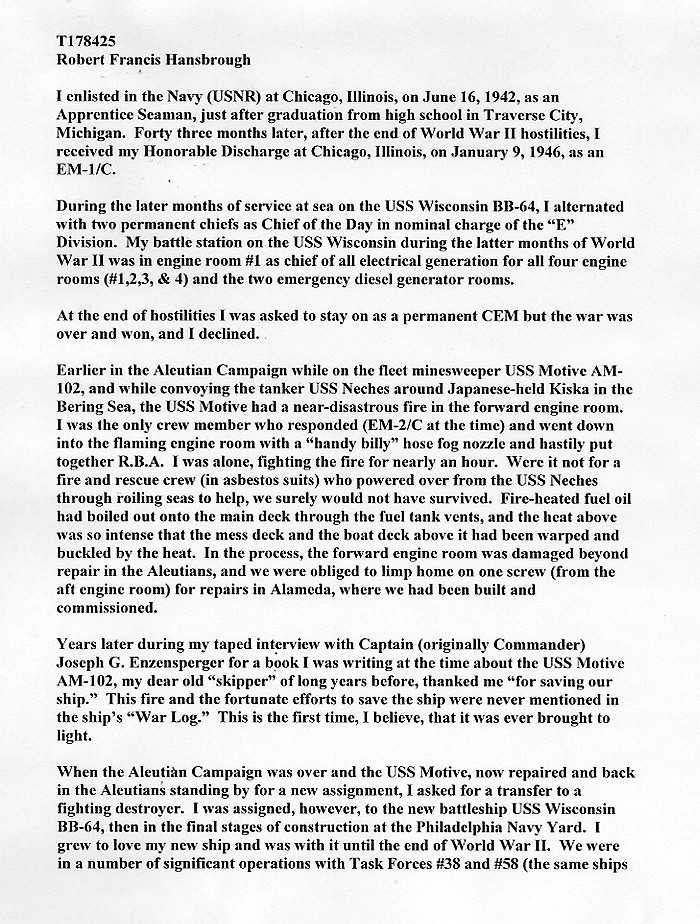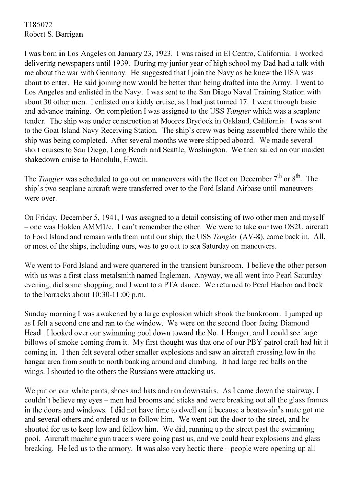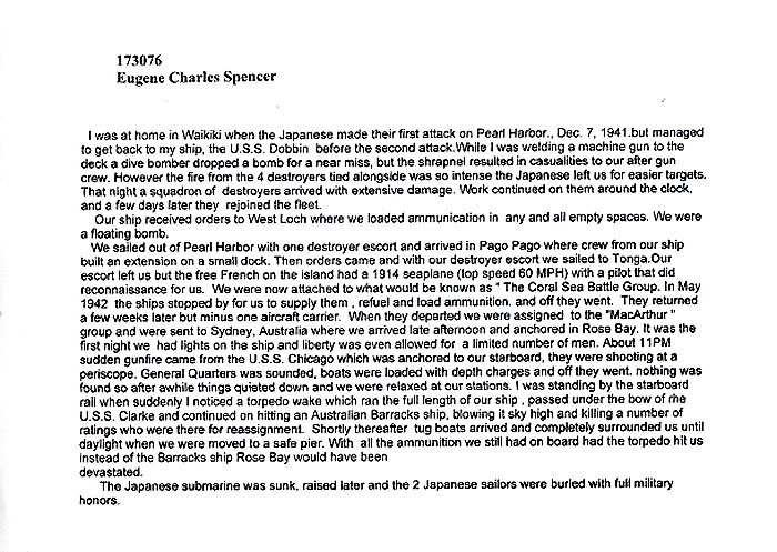 He joined the Navy in 1939, serving in the Atlantic as Chief Signalman (CSM)on the aircraft carrier USS Ranger both before and during WWII. He transferred to the submarine service in 1944 and served on the Pollack as CSM and then on the Tirante as CSM and Official Submarine photographer.  He graduated with a degree in Geology from USC.  His career emphasis was both oil and natural gas exploration throughout California.  He served as President and owner of Methane Engineering Co.  He was a member of multiple organizations emphasizing his military service, faith and community.