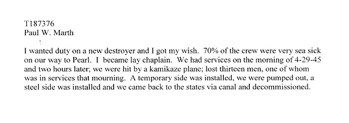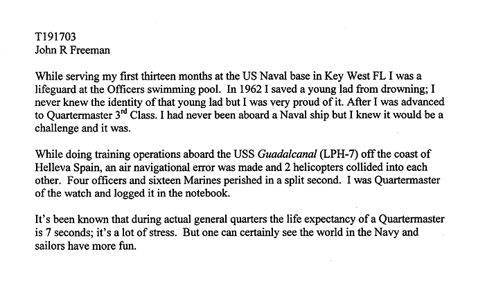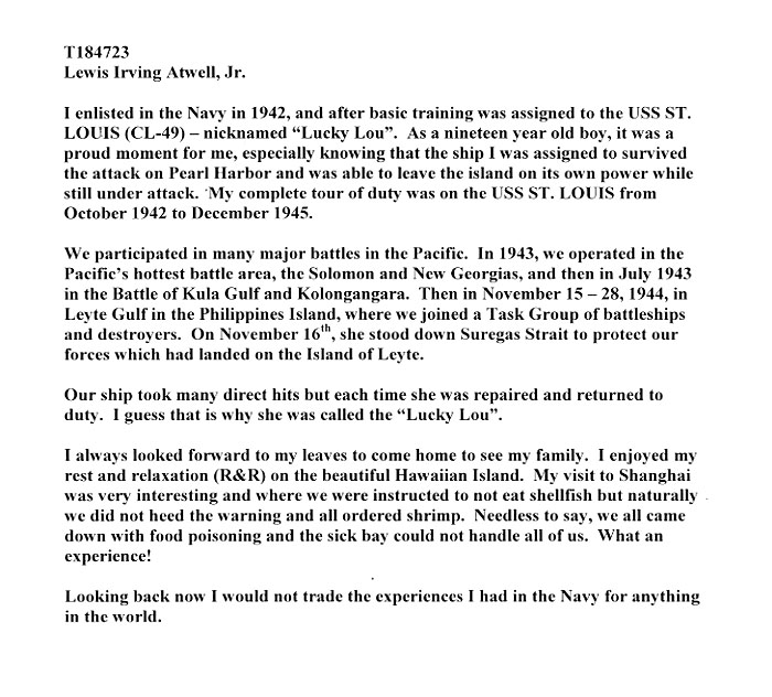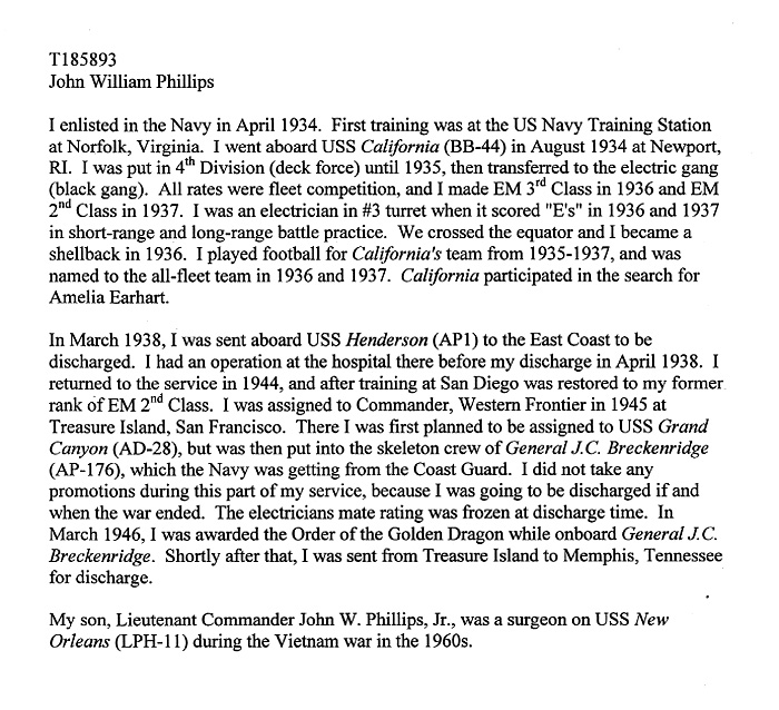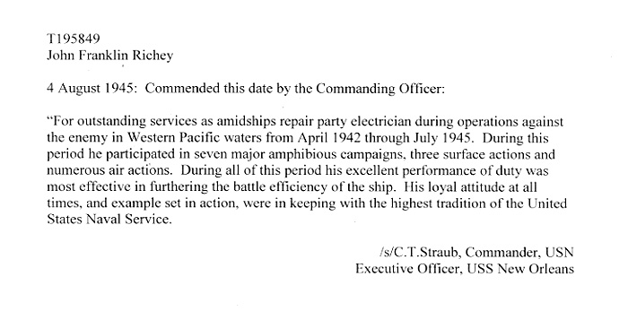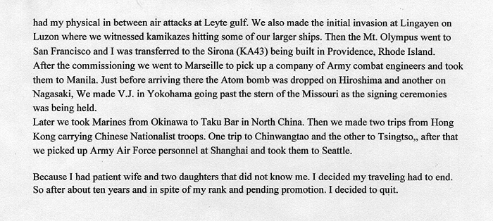 In 1941 he married my late mother who he always said was the most beautiful woman in the world. After serving through WWII and receiving a number of medals my father continued to faithfully serve for 22 years. My parents had made many good friends in the Navy and kept in touch with them through the years. As I child growing up my parents enjoyed telling me about the exciting life they lived when my father was in the Navy and what Navy life was like through the World War II period. They often spoke of how united the country was and how important that was to defeating Hitler. My parents appreciated the many wonderful friendships they formed with fellow Navy families they met from my fathers year of service. My parents were always humble, kind, and generous. Even when my father retired from the Navy he continued to work on behalf of the Naval retirees at the U. S. Naval home in Philadelphia. Then after his Naval service he worked for 20 years with civil service at the U.S. Naval depot My father was always proud of how they helped win WWII and liberated the world from Hitler.